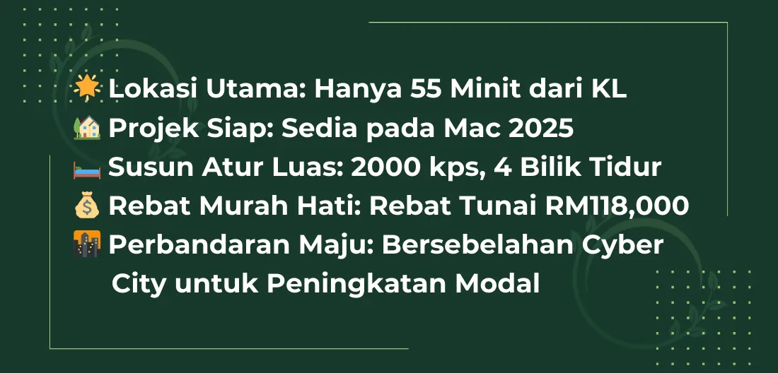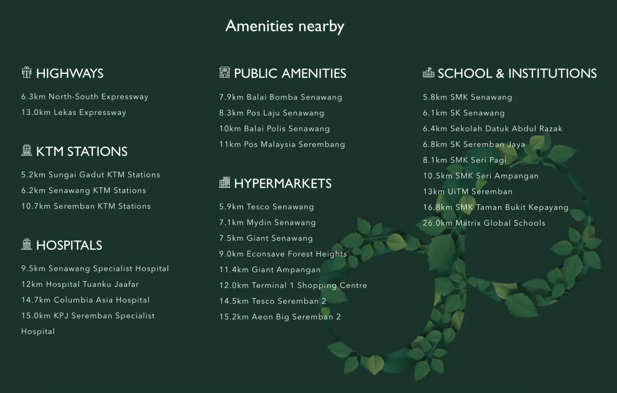 Hanya sejangkauan dari lokasinya adalah pelbagai kemudahan dan prasarana di Seremban dan Senawang, menghasilkan gaya hidup yang, walaupun terlindung dari kesibukan hidup, tetap dekat dengan semua keperluan harian anda.